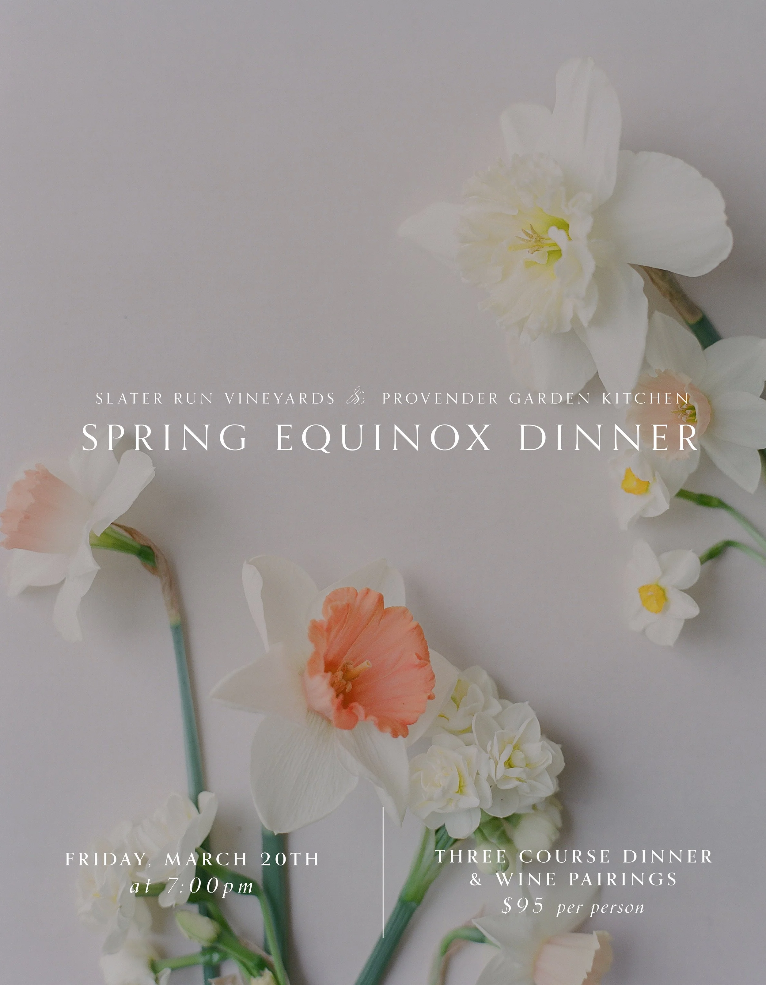 Join us at Slater Run Vineyards for a three-course wine dinner celebrating the Spring Equinox.